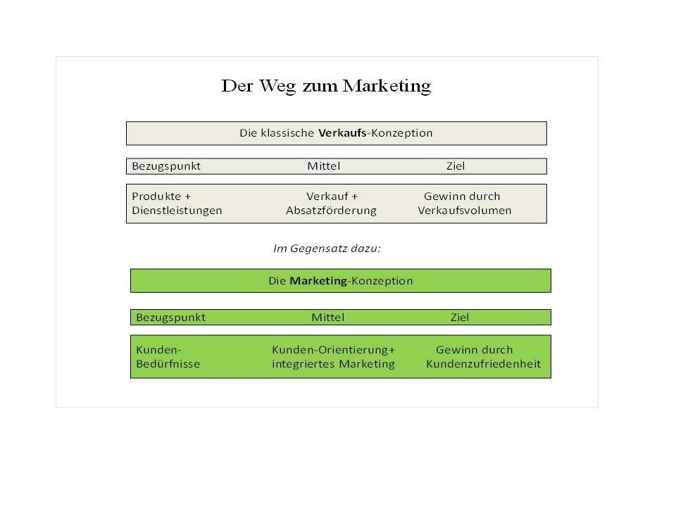Der oben skizzierte große Entwicklungsschritt hin zum Marketing basiert also auf dem Ziel, Gewinn nicht unbedingt (nur) aus dem Verkaufsvolumen, sondern vor allen Dingen durch Kundenzufriedenheit zu erzielen, genau genommen durch die Schaffung von profitabler Kundenzufriedenheit. Wesentliche Voraussetzungen dafür sind die konsequente Markt- und Kundenorientierung, die Konzentration auf fundamentale Kundenbedürfnisse, Kunden-probleme und deren Lösung sowie ein sehr gut funktionierendes Kunden-Management.
