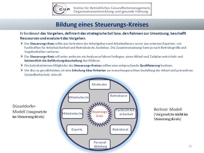 Selbstverständlich können von kleinen und mittleren Unternehmen nicht alle Voraussetzungen in gleicher Breite und Tiefe erfüllt werden, da es beispielsweise keinen Betriebsrat oder ein etabliertes Betriebliches Gesundheitsmanagement gibt. So sollen nachfolgende Hinweise vor allen Dingen Orientierung geben.