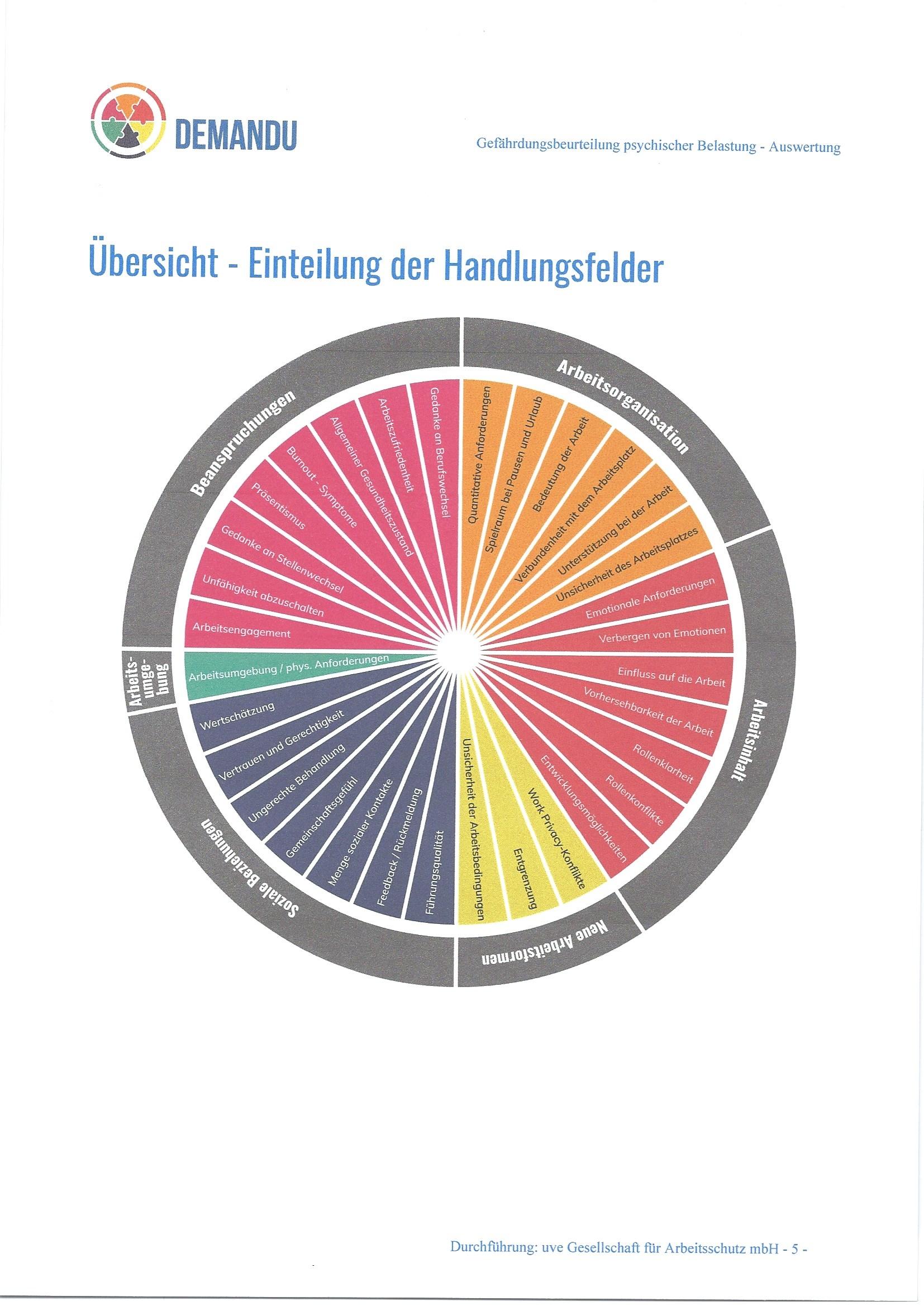 Der Arbeitgeber erhält ein ausführliches Auswertungsdokument aller zusammengefassten Antworten inkl. Bewertung und Handlungsempfehlungen zur gezielten Entwicklung von Maßnahmen zur Verbesserung der Arbeitsbedingungen.